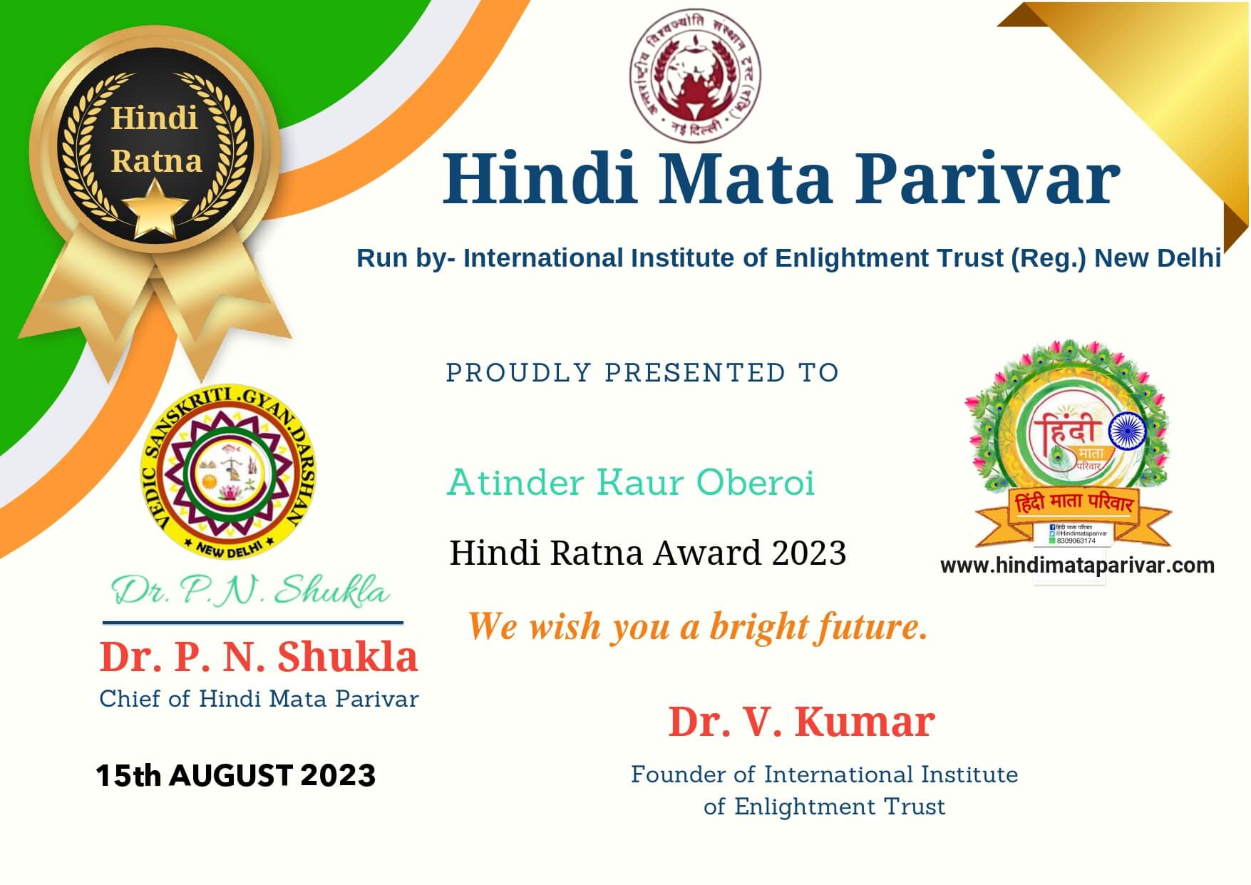 Hindi Ratna Award to Mrs Atinder Oberoi